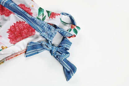 Deep V Neck Bikini Floral Print Swimsuit Bow Swimwear Lace Up Bikini Set
