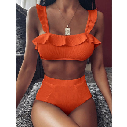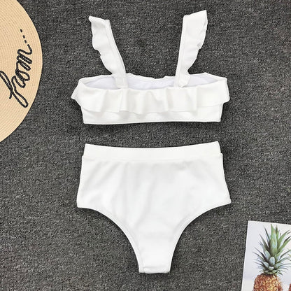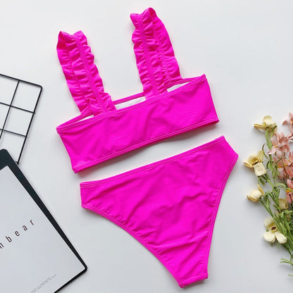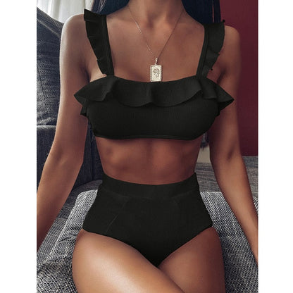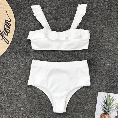 2 Piece Ruffle High Waist Swimwear Women Swimsuit Push Up Bikini Set Solid Bathing Suit Summer Beach Wear Swimming Suit