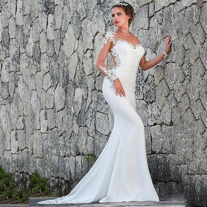 Vintage Mermaid Wedding Dress Scoop-Neck Full Sleeves Wedding Gown Zipper Back Lace Satin Bride Dress Robe