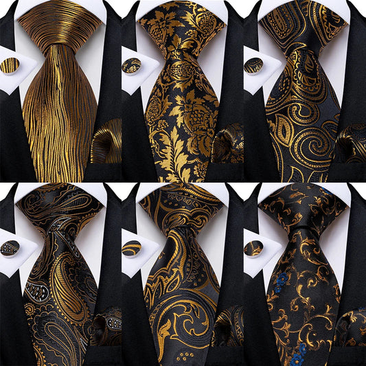 Luxury Black & Gold Paisley Silk Tie Set – Men's Necktie, Pocket Square & Cufflinks Gift