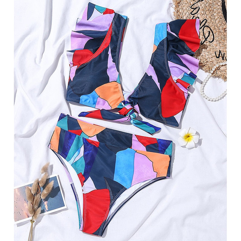 Pay in 4 instalments with AfterPay, Buy Now Pay Later2 Piece Geometry print swimsuit Sexy ruffle bikini High waist swimwear Bandeau knot bathing suit Vintage beach wear