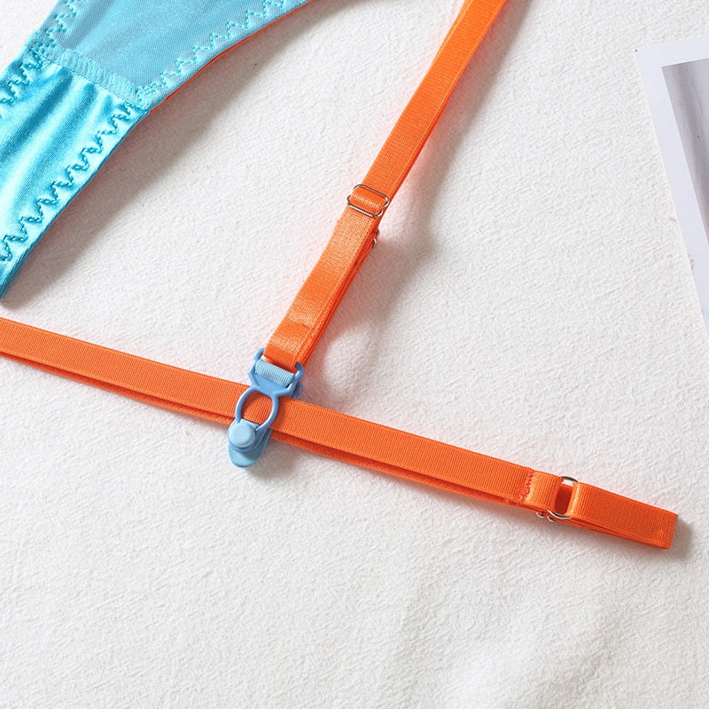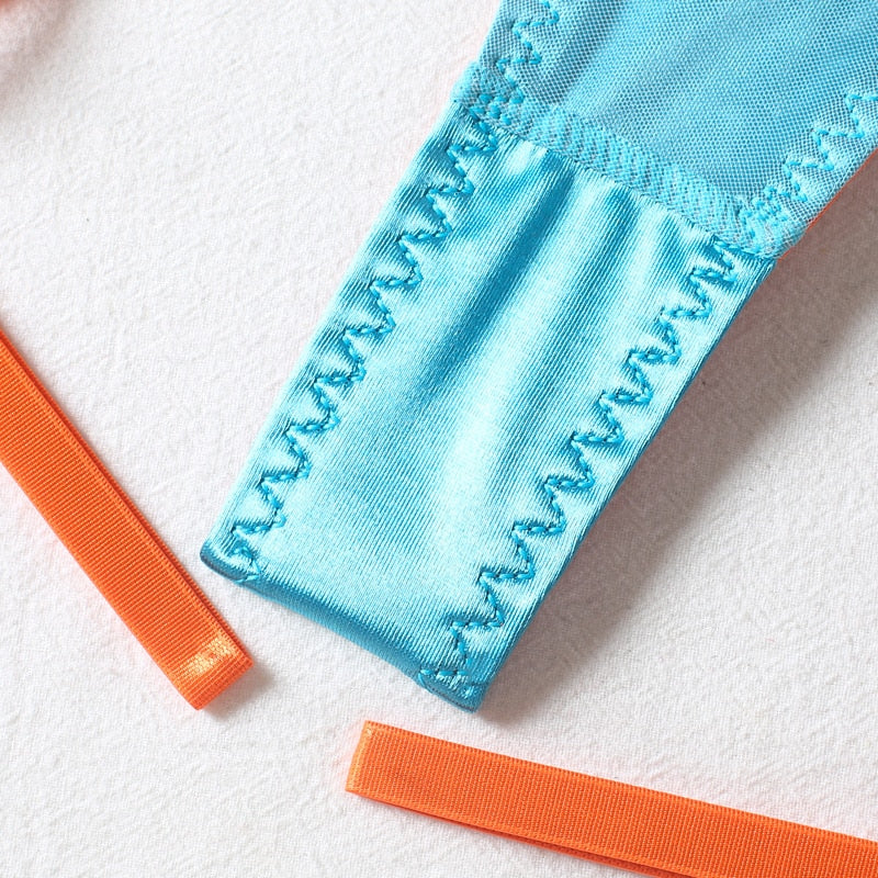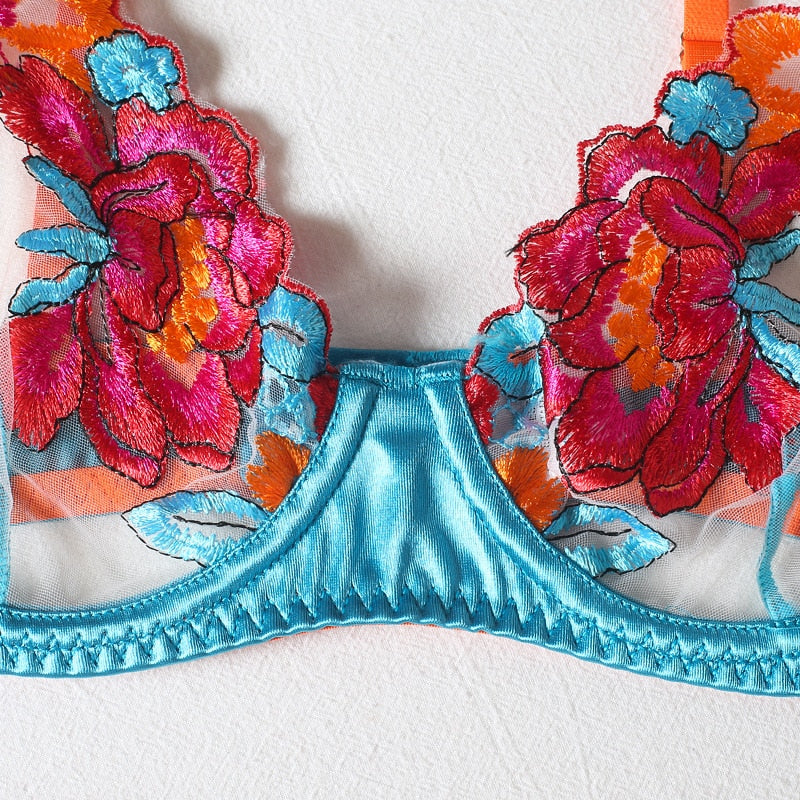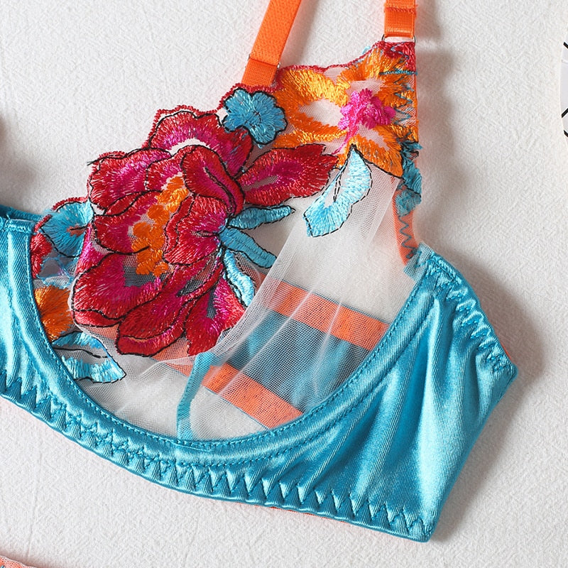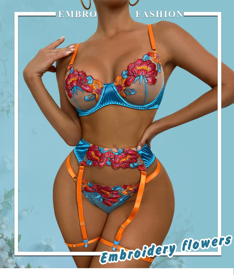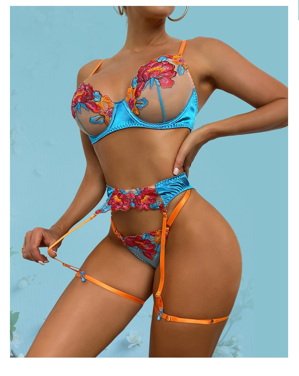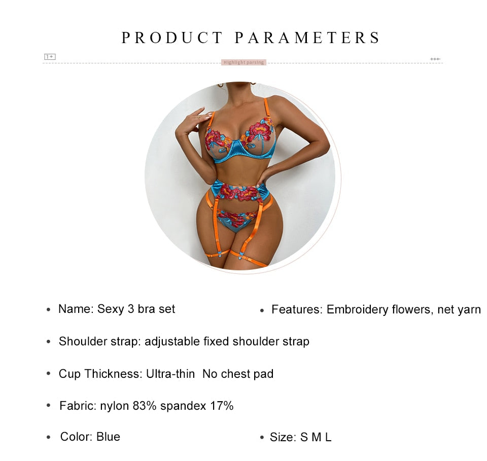 3 Piece Transparent Floral Lace Lingerie Set Garter Lace Blue Underwear Fancy Beautiful Thongs Breves Sets