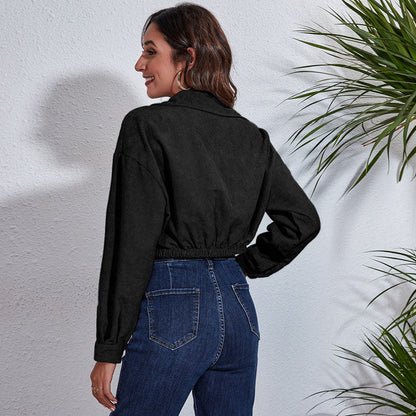 Autumn Spring Short Jacket Loose Turn Down Collar Long Sleeve Corduroy Coat Outerwear