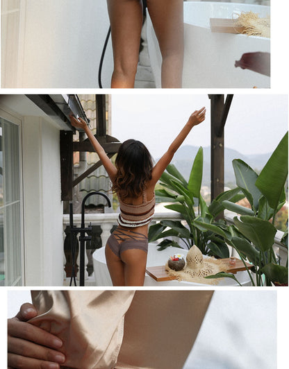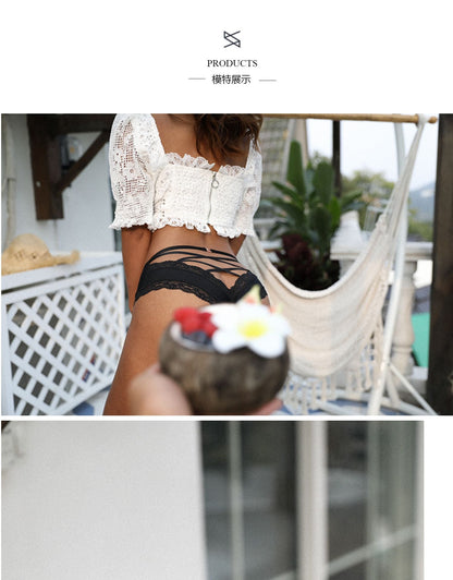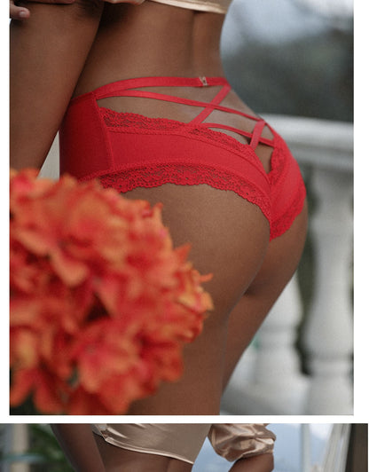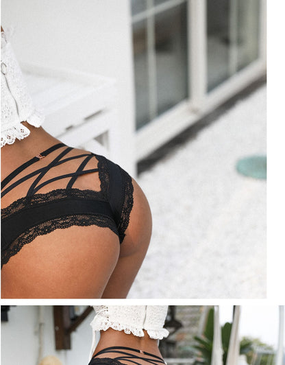Back Crossing Bandage Hollow Out Lace Edge Seamless Underwear Women Transparent Lingerie Solid Briefs Thong Sexy Panties