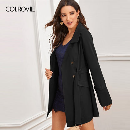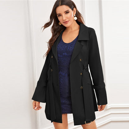 Pay in 4 instalments with AfterPay, Buy Now Pay LaterBlack Notch Collar Double Breasted D-ring Belted Coat Solid Coat And Jackets Ladies Outerwear