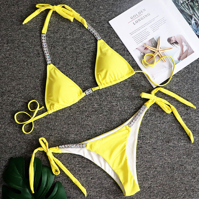 Crystal Diamond Bandeau Swimsuit Halter Swimwear Two piece Bikini Rhinestone Push up Bathing Suit