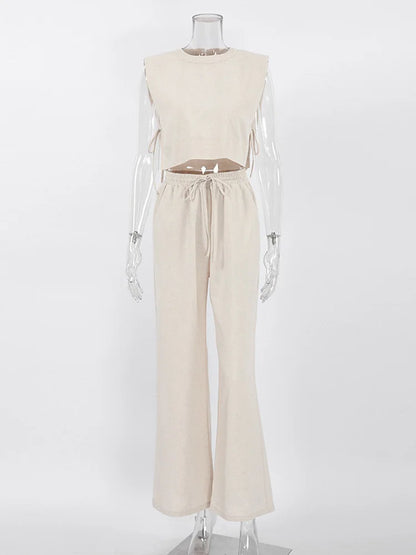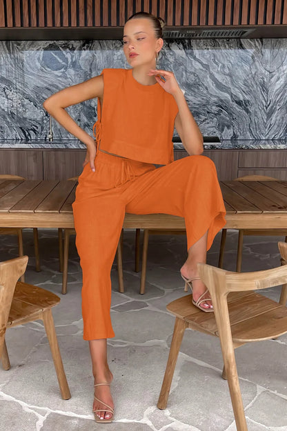 Spring Summer Holiday Linen Pant Set Crop Tops Solid Outfits 2 Two Piece Matching Outfit Set For Women