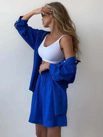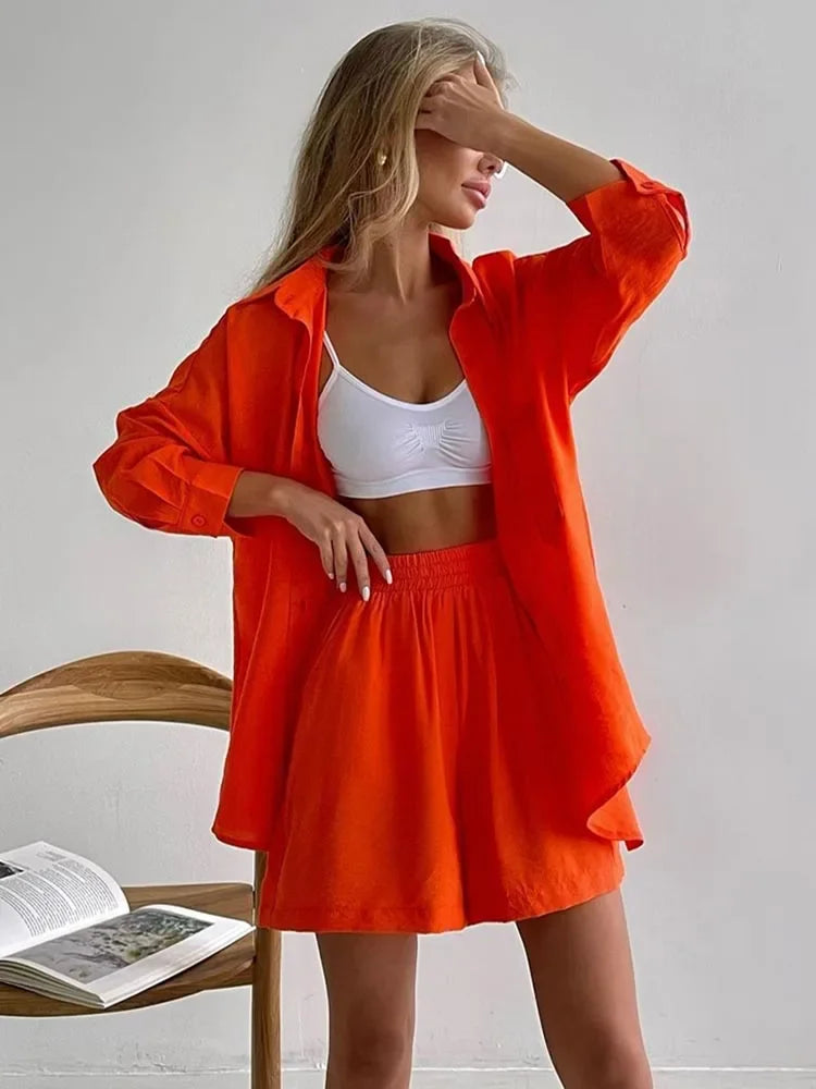 Summer Women's Suit Cotton Casual Shorts and Shirts 2 Piece Matching Outfit Set Linen Fashion Blouse Women's Suit