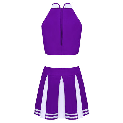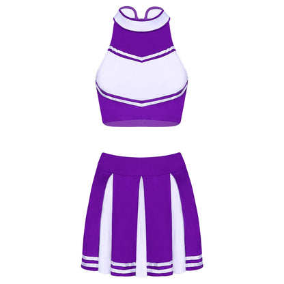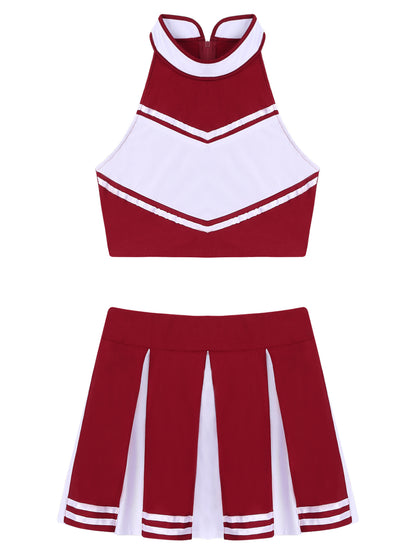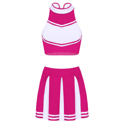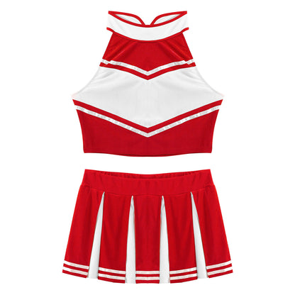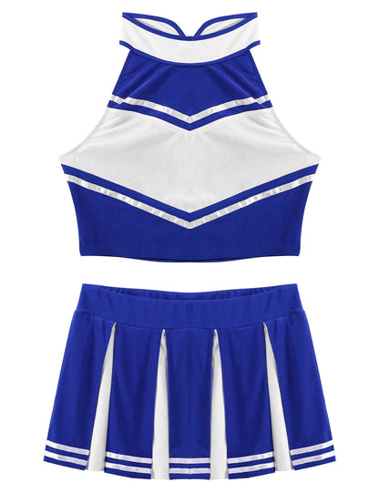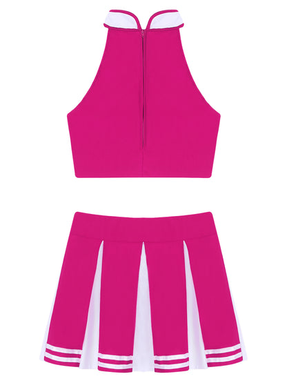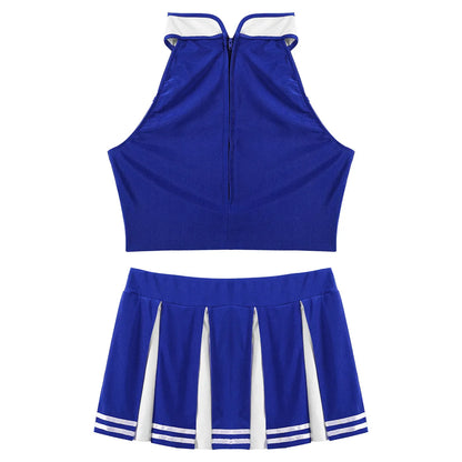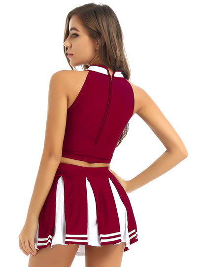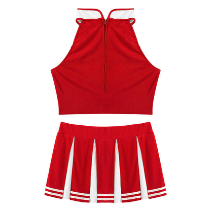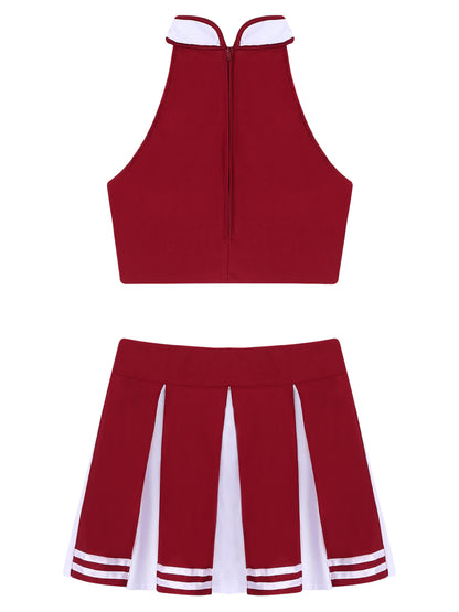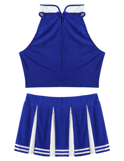 Women's Cheerleading Costume Uniform Carnival Cosplay Outfit Stand Collar Sleeveless Crop Top with Mini Pleated Skirt