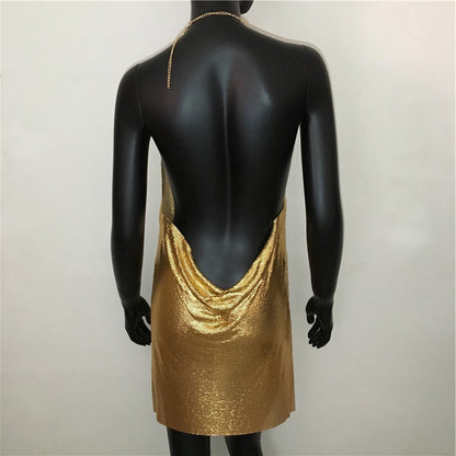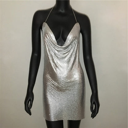 Deep V Neck Blackless Halter Silver Metal Sequined Slit Stage Show Party Mini Dresses
