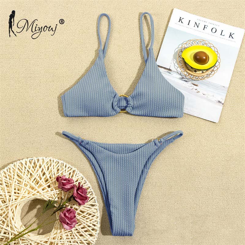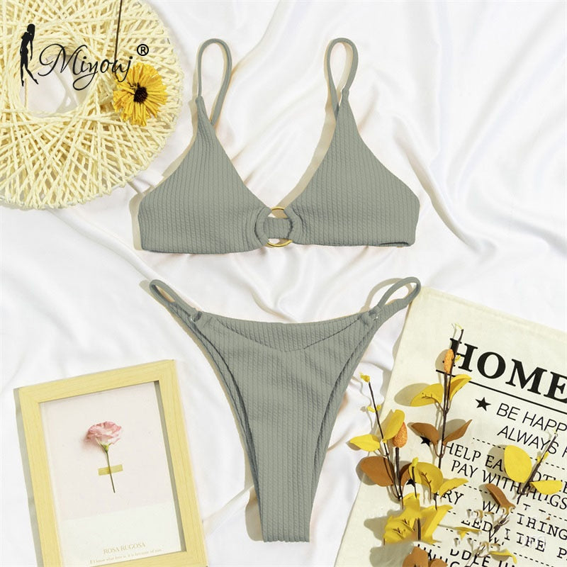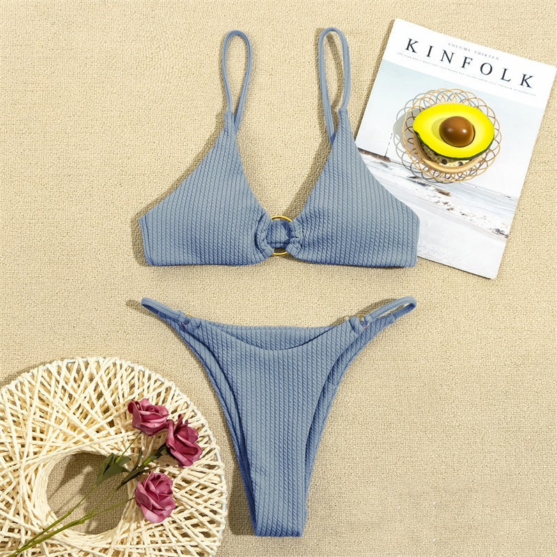 High Cut Rib Swimwear Solid Beachwear Bathing Suits Rings Bikini Sets Hollow Out Swimsuit