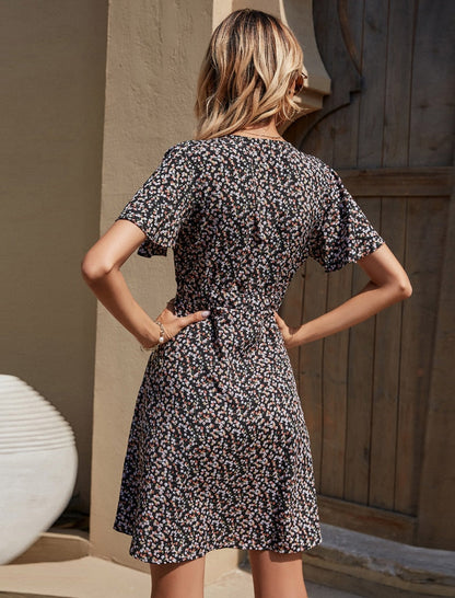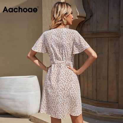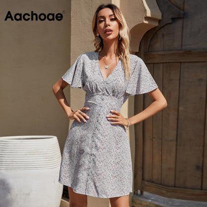 Summer Elegant A Line Dress V Neck Floral Print Mini Dress Flare Short Sleeve Button Party Dress