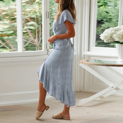 Summer Long Maxi Casual Boho Floral Print Beach V-Neck Ruffle Bodycon Wrap High Slit Party Dress