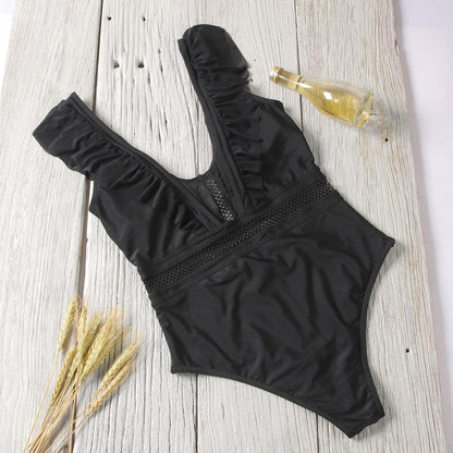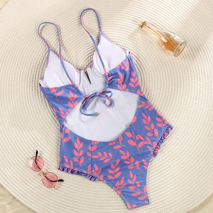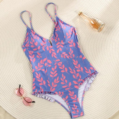 1Piece V Neck Swimwear Bathing Suit Floral Purple Black Monokini Ruffle One Piece Swimsuit