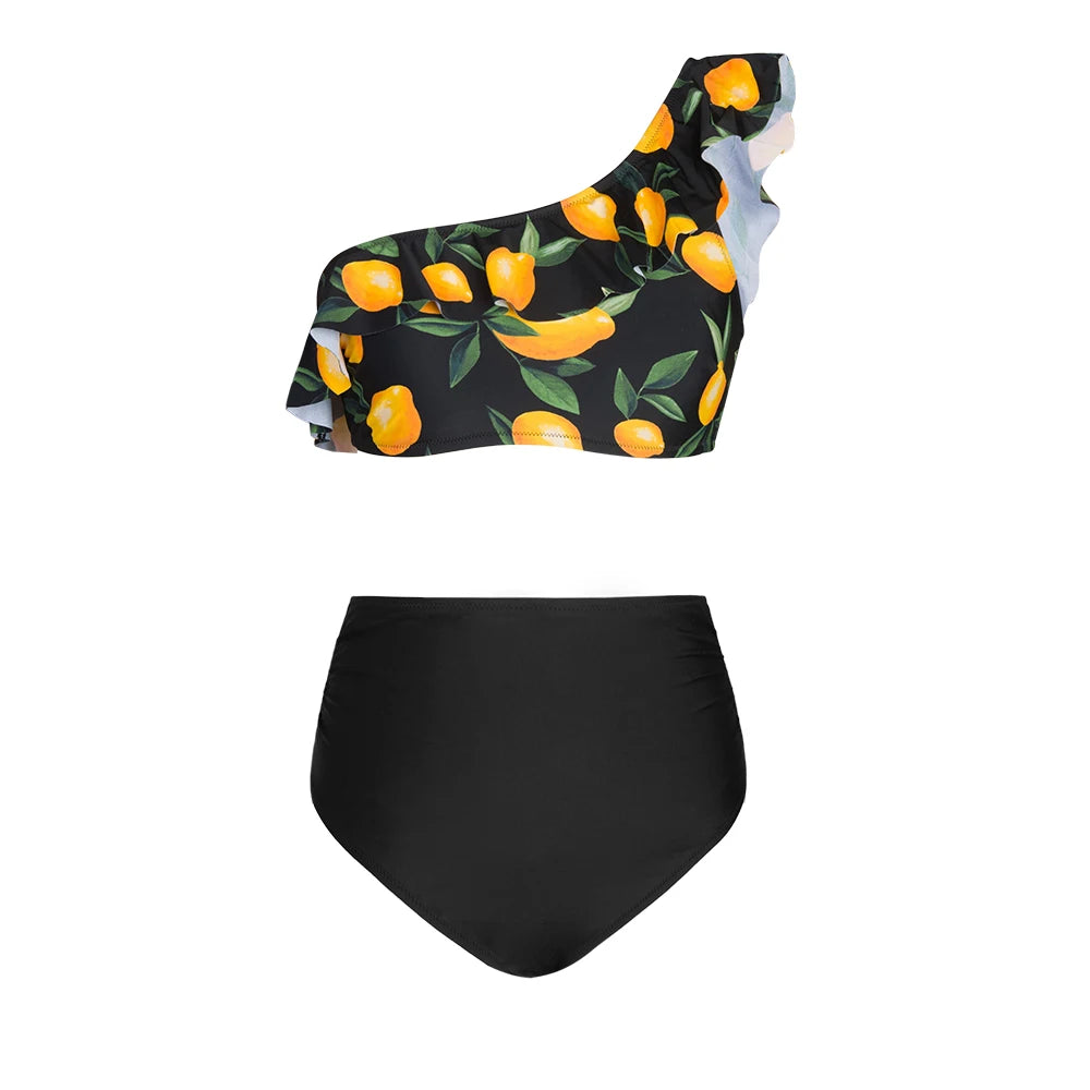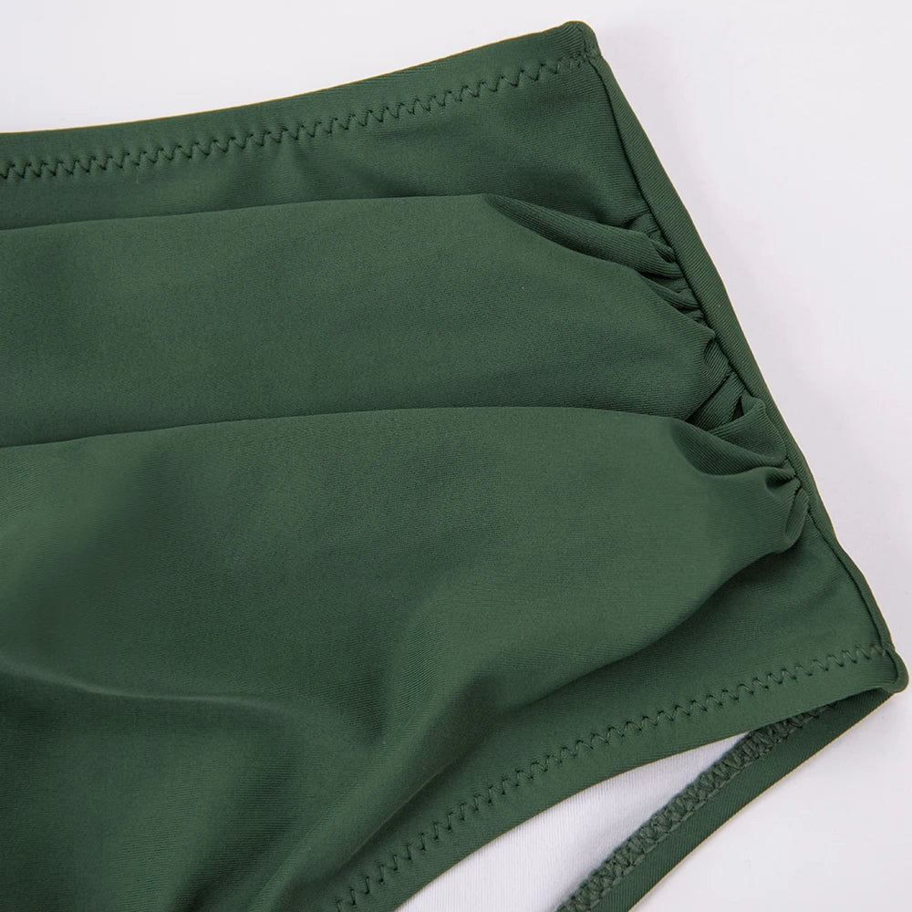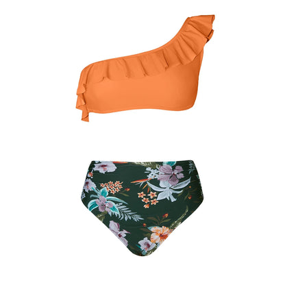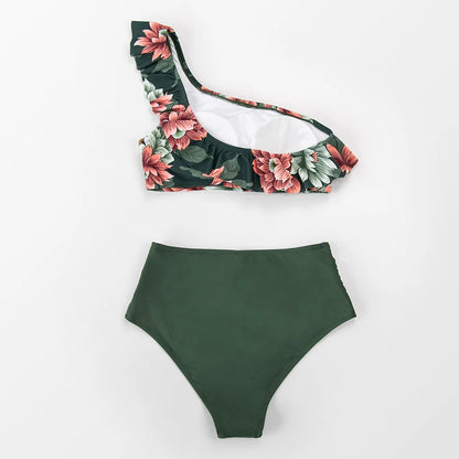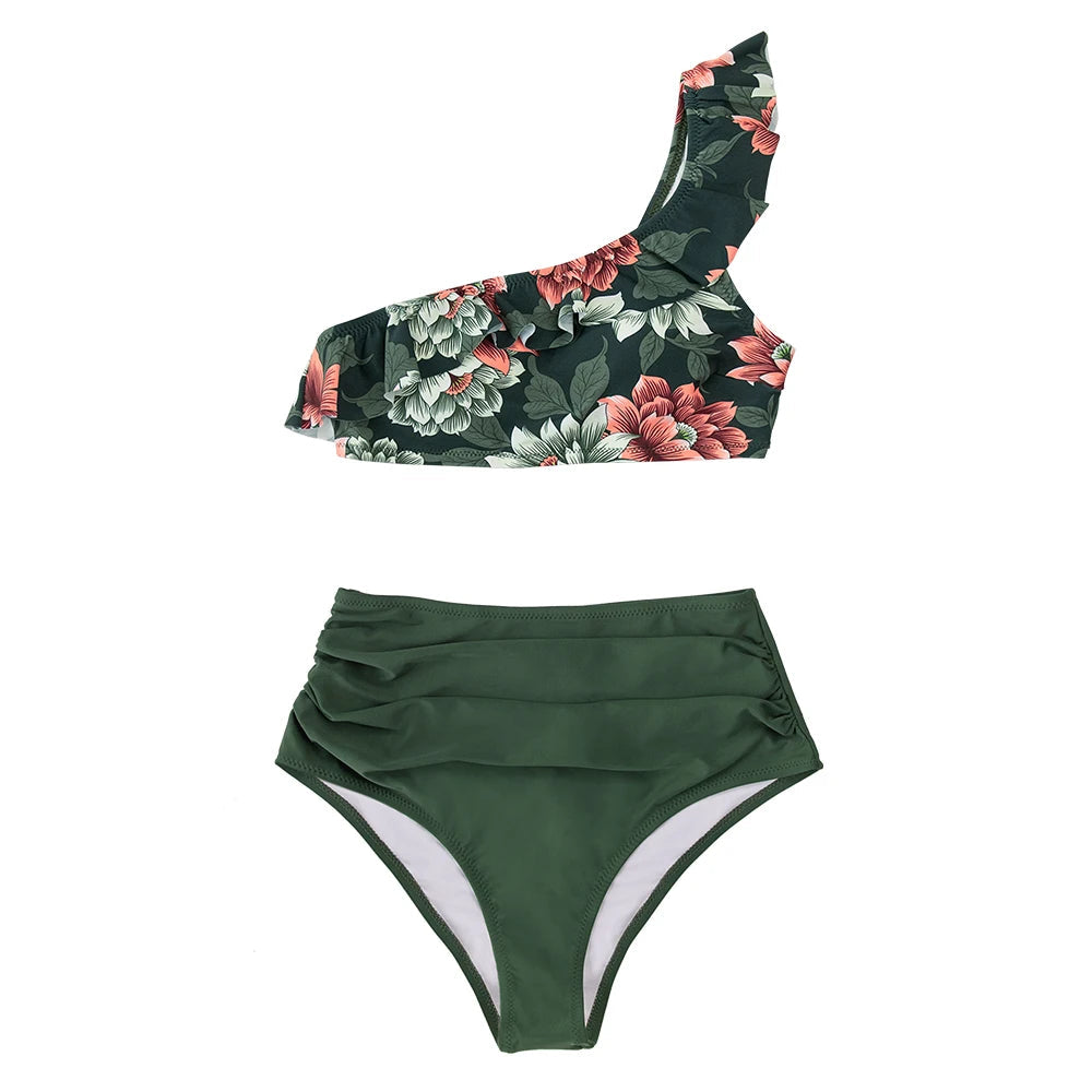 Green Floral One Shoulder Bikini Sets High Waist Swimsuit Two Pieces Swimwear Women Bathing Suit