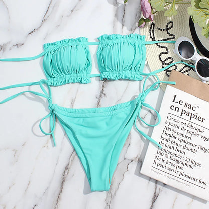 2 Piece Pleated Bandeau Swimsuit Low Waist Swimwear Beach Wear Mini Thong Bikini Set Bathing Suit