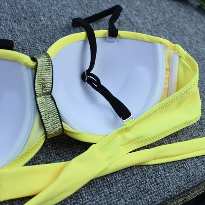 2 Piece Women Swimsuit Solid Colour Short Puff Sleeve Summer High Waist Cut Backless Bathing Suit Beachwear Bikini Set