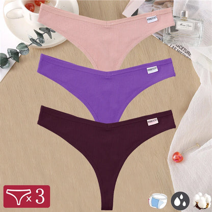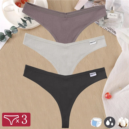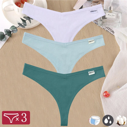 3 Pack Cotton Thongs Lady Solid V-Waist Stripe Panties Breathable G-String Underwear Soft Intimates Lingerie