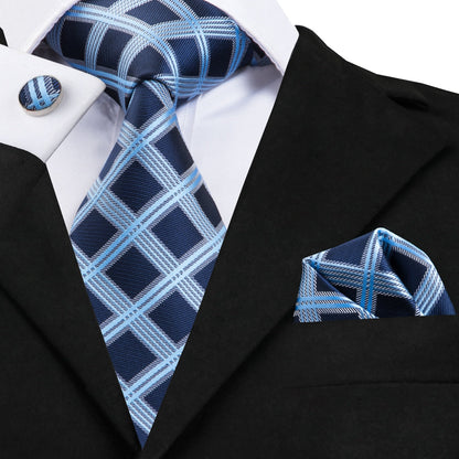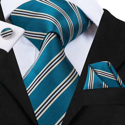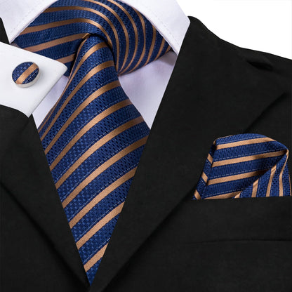 3 Piece Business Classic Blue Black Striped Solid Men's 3.4" Brand Necktie Pocket Square Cufflinks Wedding Party Silk Tie Set