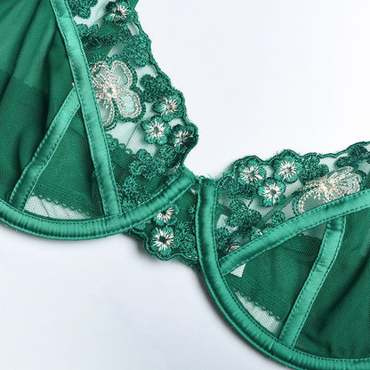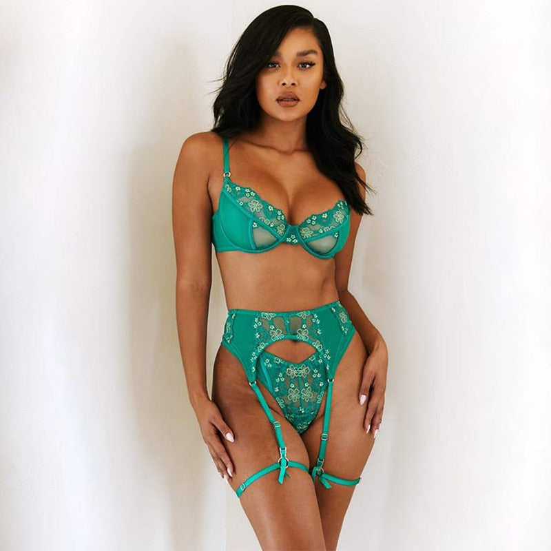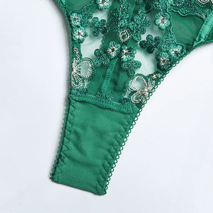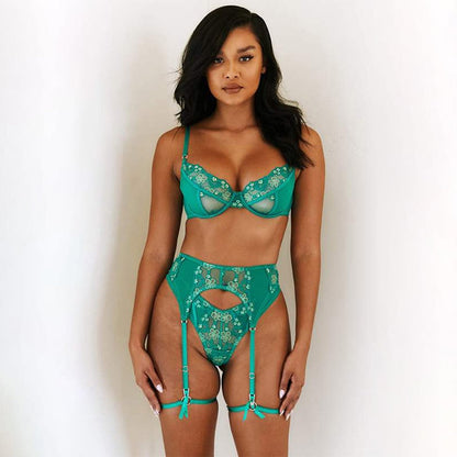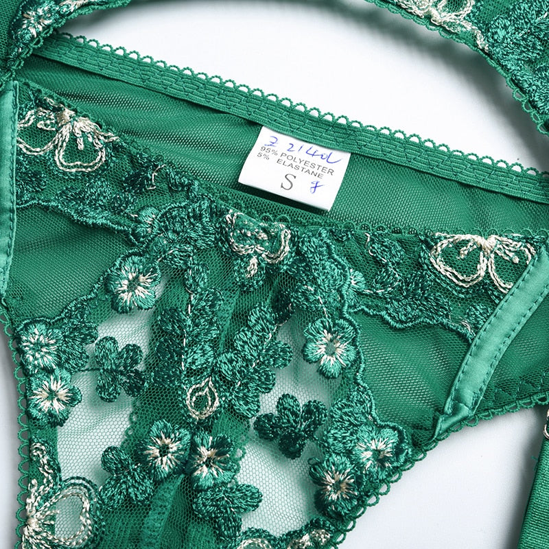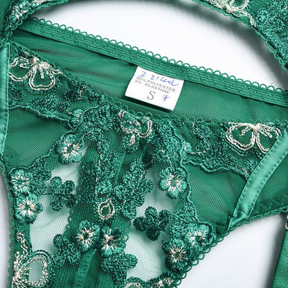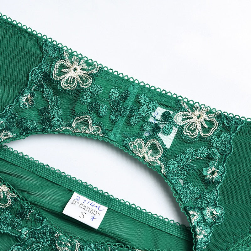 3 Piece Fancy Embroidered Bra Underwear Lace Sensual Briefs Sets with Garters Lingerie Set
