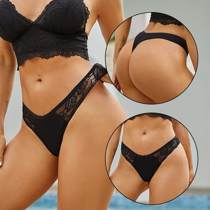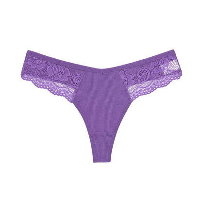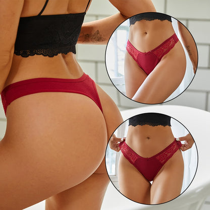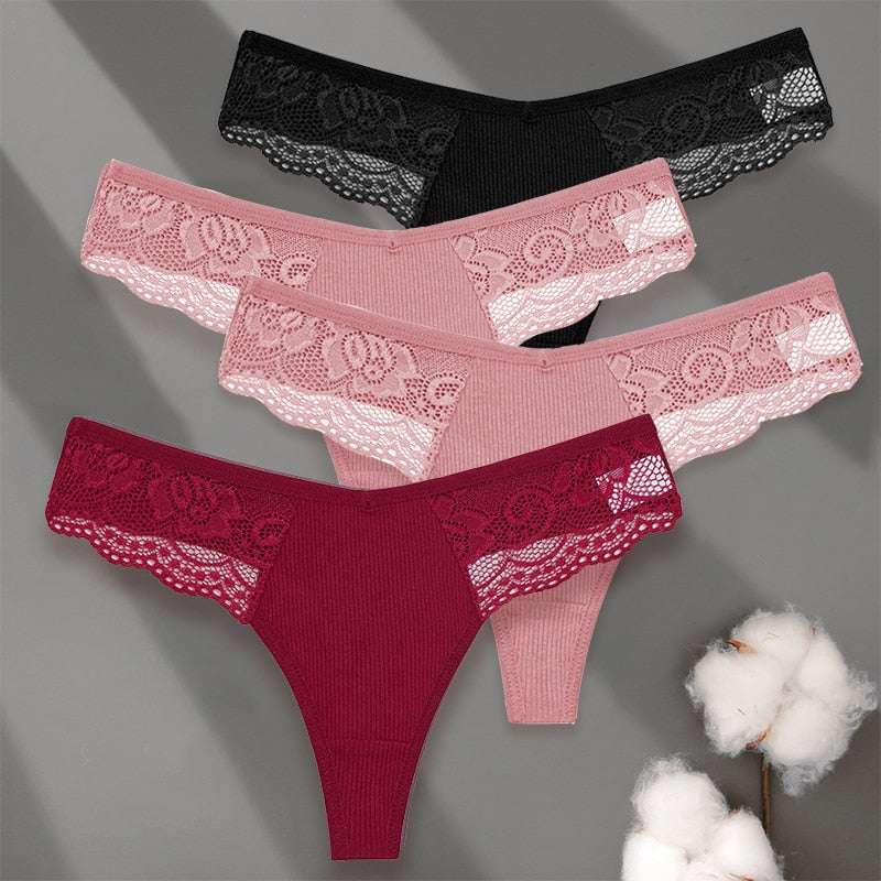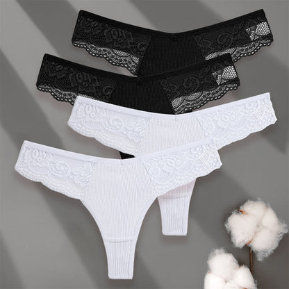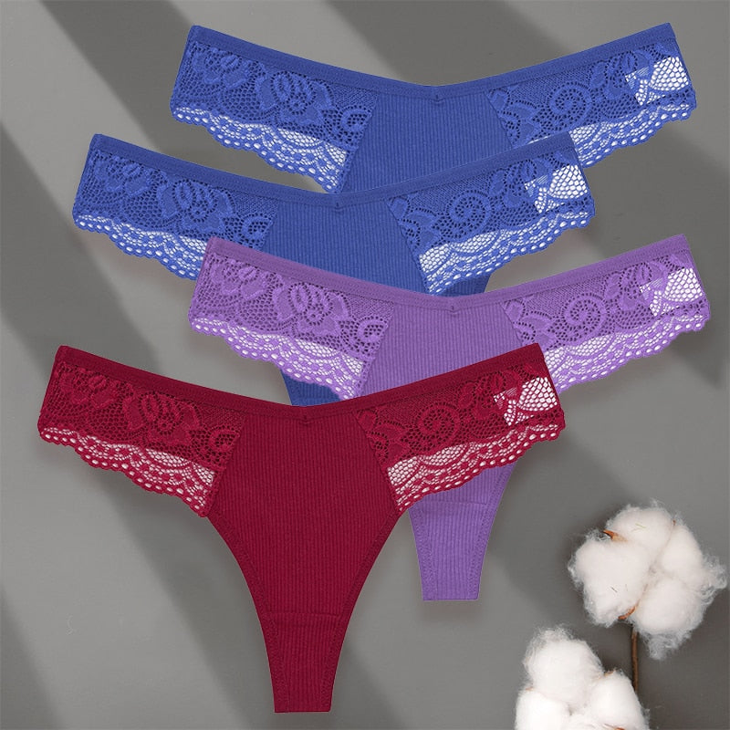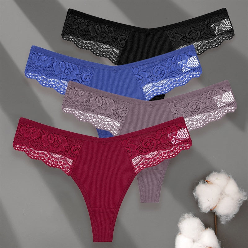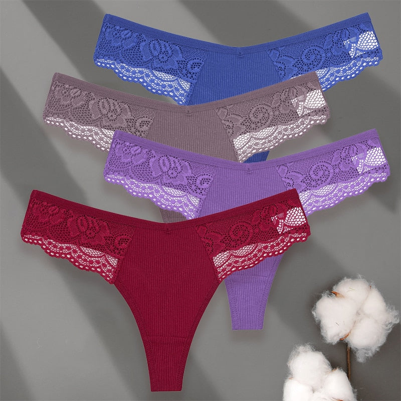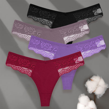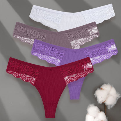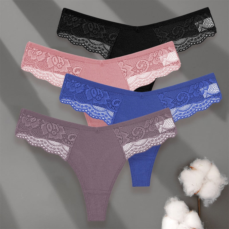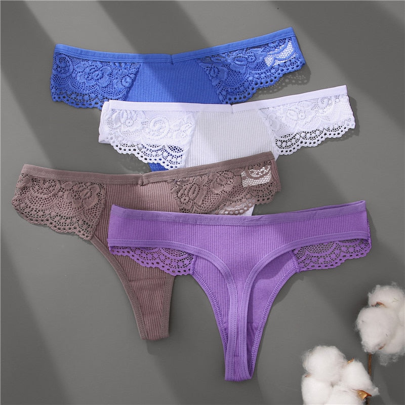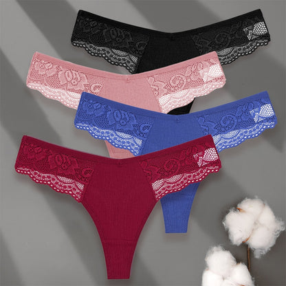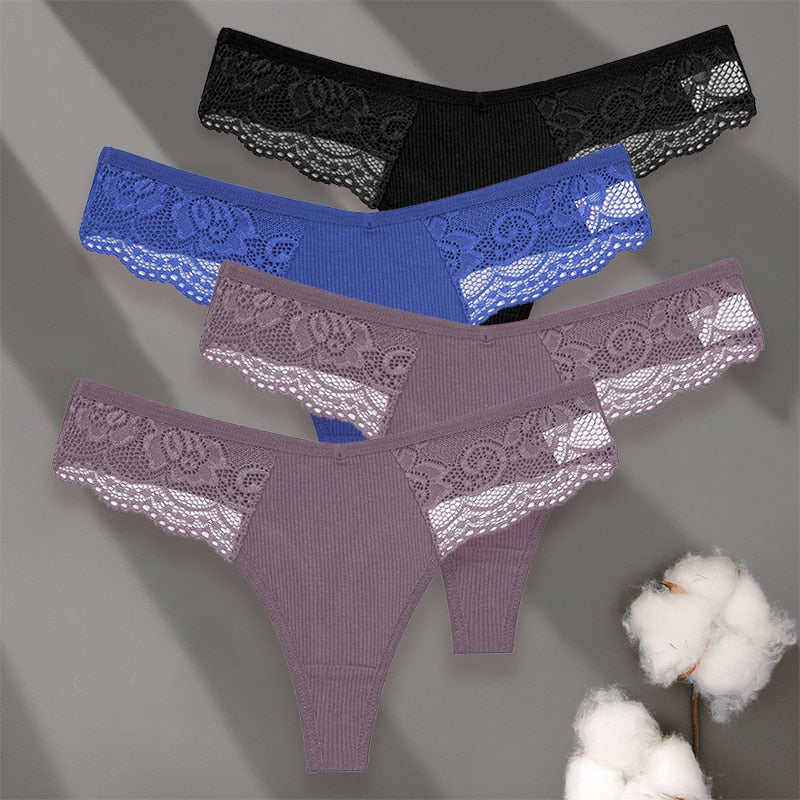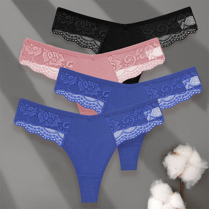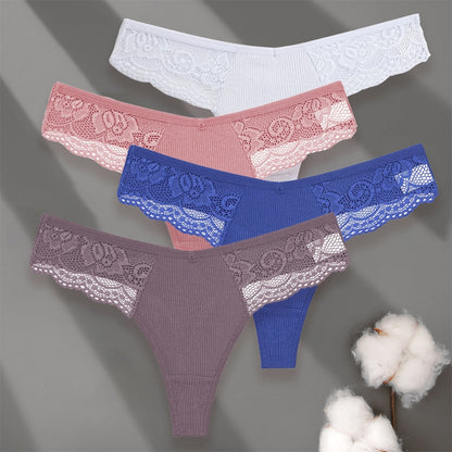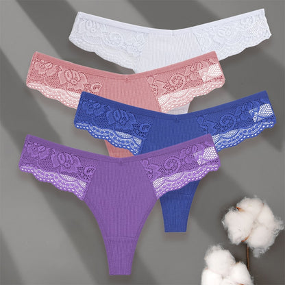 4 Pack set V-Waist Women Cotton G-string Lace Lingerie Panties Thongs Femme Underwear Underpant Intimates