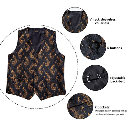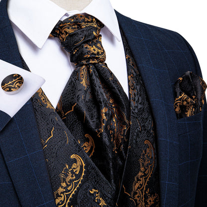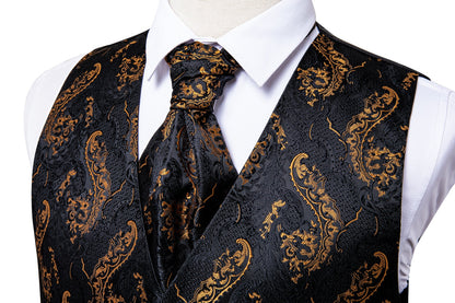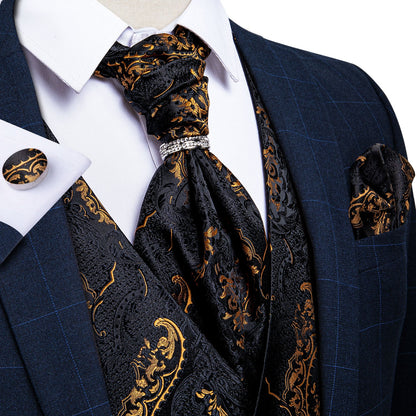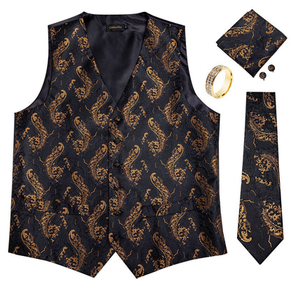 5 Piece Men Gold Paisley Silk Waistcoat Ascot Tie Pocket Square Necktie Ring Set Wedding Formal Dress Vests Set