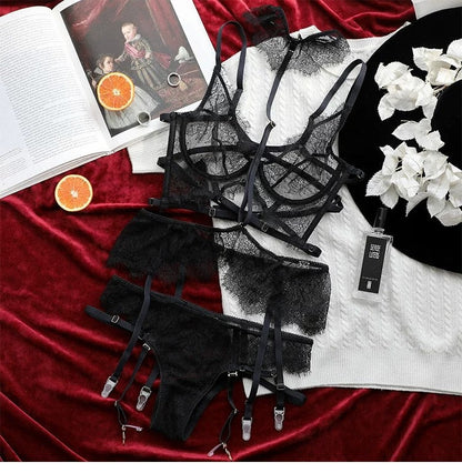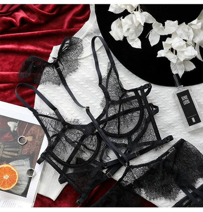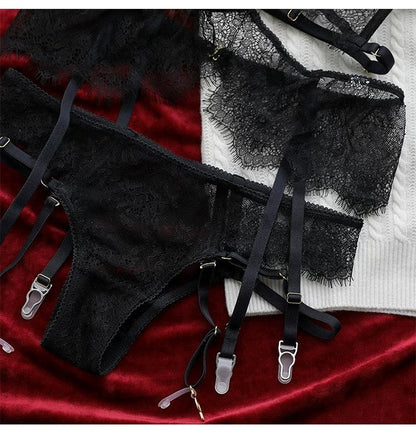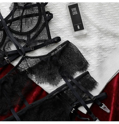 Pay in 4 instalments with AfterPay, Buy Now Pay LaterBlack Halter Neck Bandage Bra Thongs Underwear Sexy Lingerie Lace See Through Bra and Panty Set with Garter Belt Suspenders