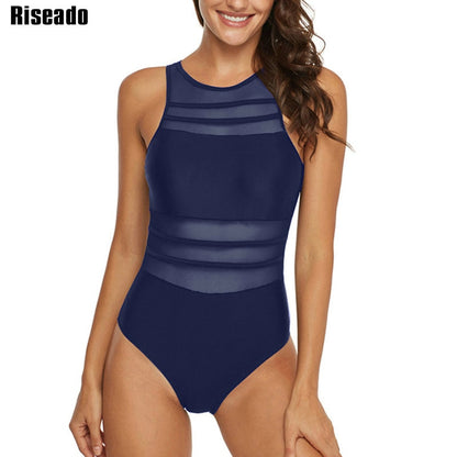 Black Mesh One Piece Swimsuit Swimwear High Neck Bathing Suit Women Backless Bodysuits Plus Size