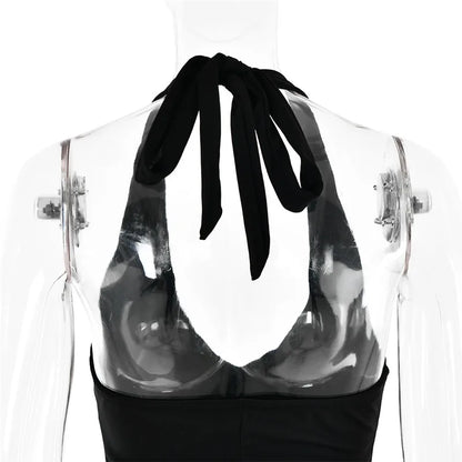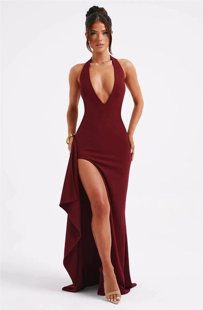 This long dress features a deep V-neck, thigh-high split, and halter top with a sleeveless and backless design. Perfect for club and party occasions, it accentuates curves and adds a touch of elegance to any ensemble.