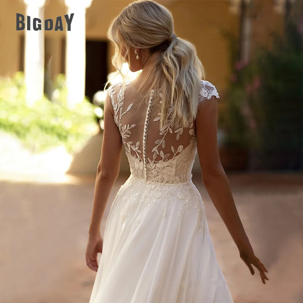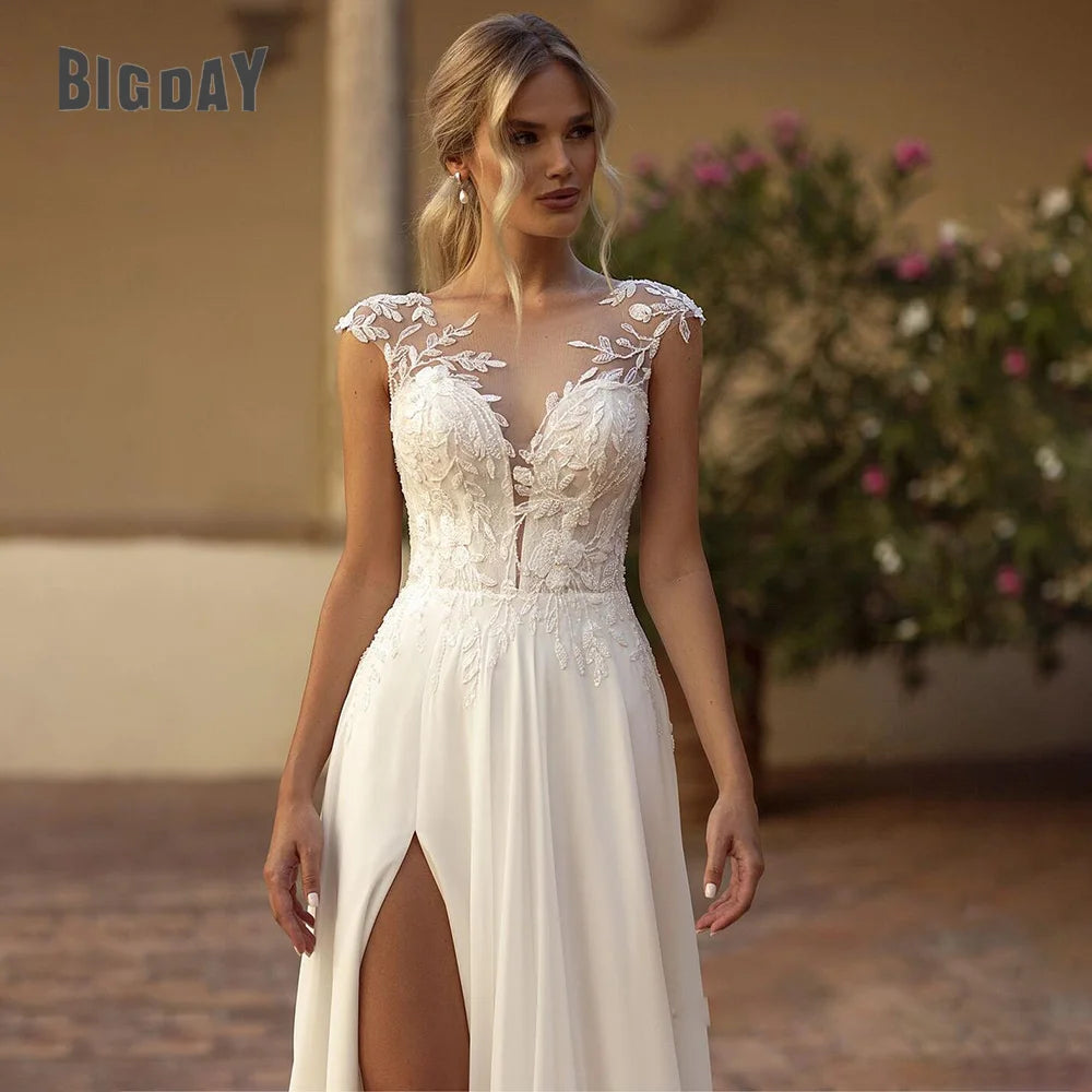 Elegant Boho Lace Wedding Dress Chiffon O-Neck Illusion Back Side Split Applique Bridal Party Gown Customised Wedding Dress