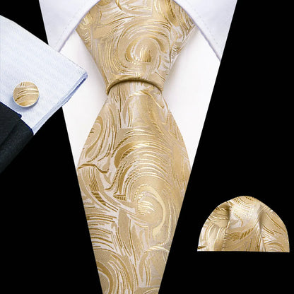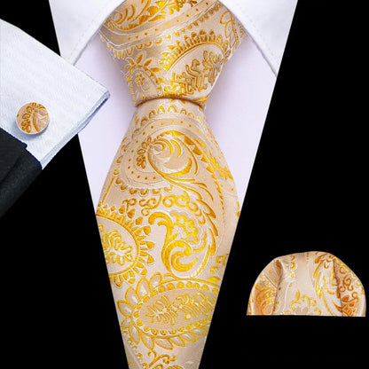 Elegant Men's Gold Leaves Floral Silk Neck Tie Pocket Square Cufflinks Wedding Business Party Gift Set