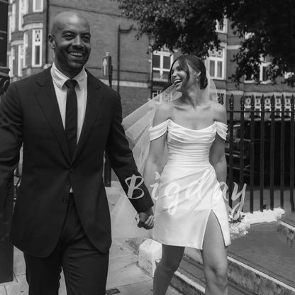 Elegant Short Wedding Dresses Women's White Open Back Off The Shoulder Satin Pleat Side Split Bridal Gown