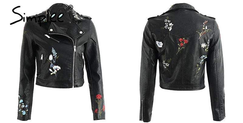 Embroidery faux leather coat Motorcycle zipper wine red leather jacket women Fashion cool outerwear winter jacket