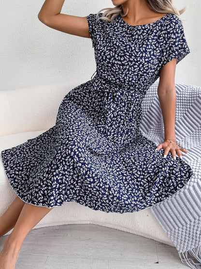 Floral Pleated A Line Long Dress Spring Summer Short Sleeve High Waist Chic Dress