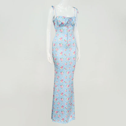 Floral Print Casual Long Bodycon Strapless Club Party Dresses Spaghetti Strap Dress