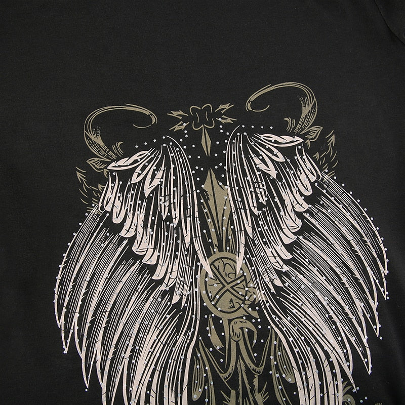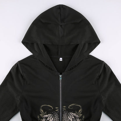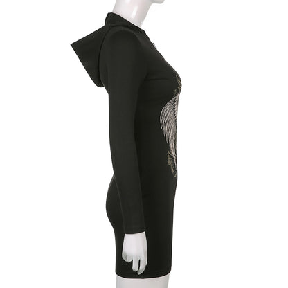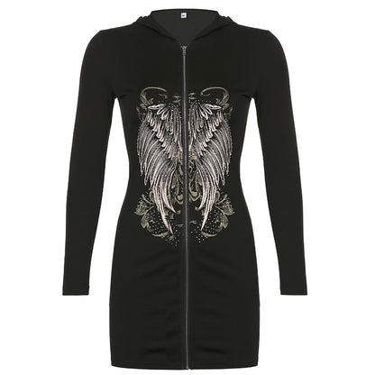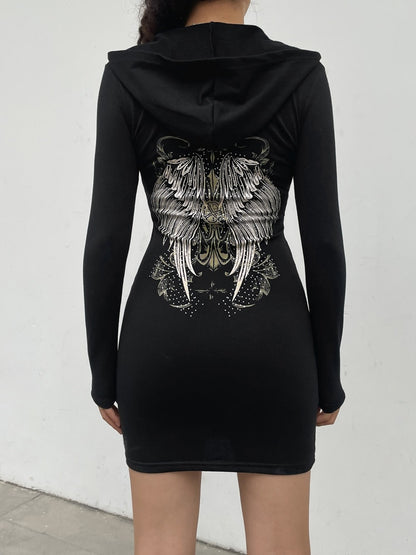 Gothic Grunge Fairycore Wings Printed Graphic Zipper Hooded Bodycon Dark Academia Autumn Mini Dresses Y2K Dress