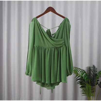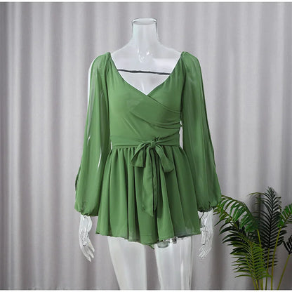 Pay in 4 instalments with AfterPay, Buy Now Pay LaterGreen Pleated Mini Elegant V-neck Split Long Sleeve A-line Summer Lady Solid Backless Lace Up Dress