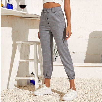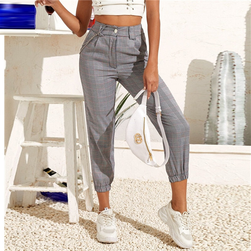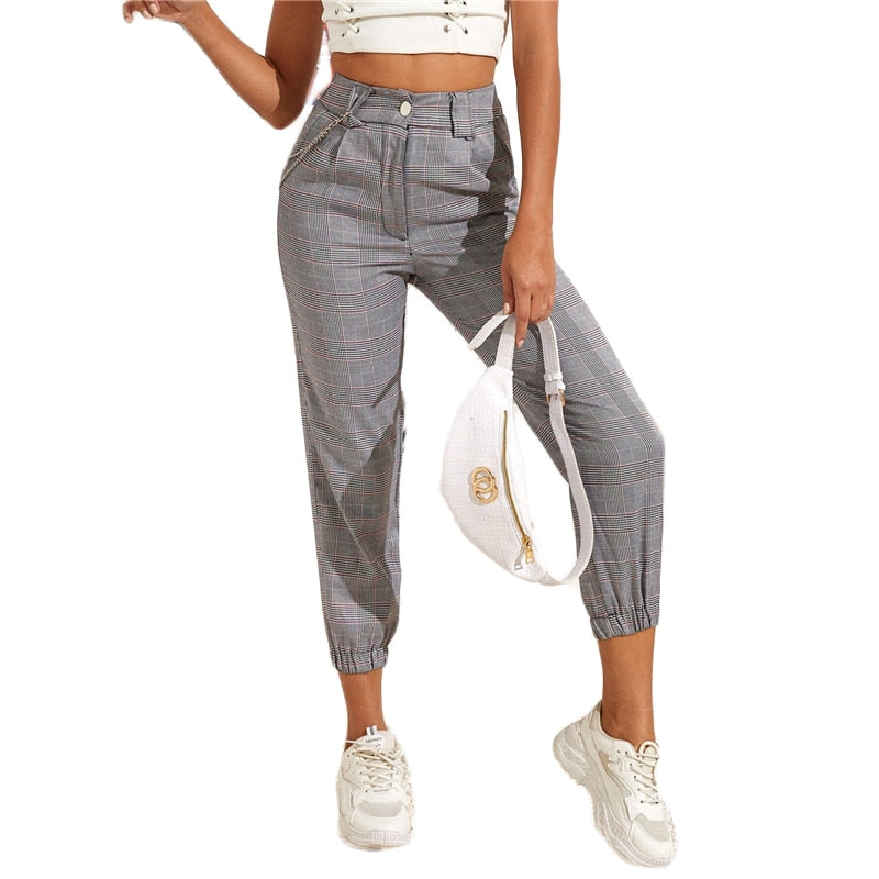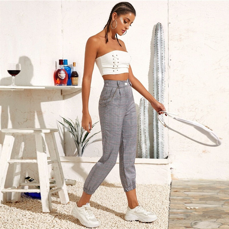 Grey Chain Detail Plaid Crop Spring Summer Mid Waist Buttoned Zipper Fly Trousers Carrot Pants