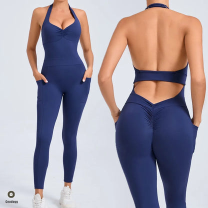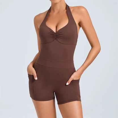Hollow Backless Sport Short One Piece Jumpsuit Pocket Unitard Yoga Set Gym Women Romper Fitness Scrunch Squat Outfit Set