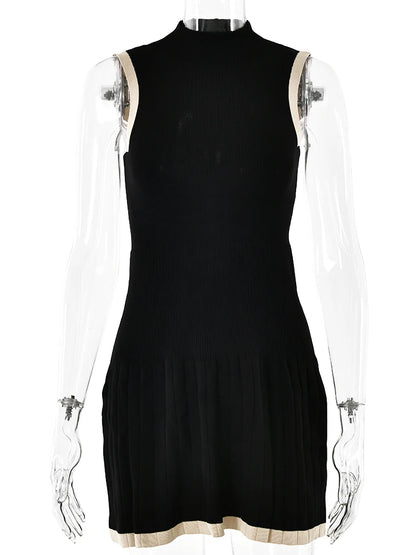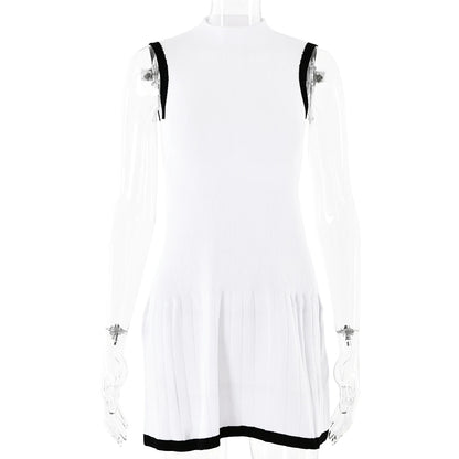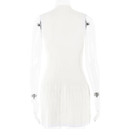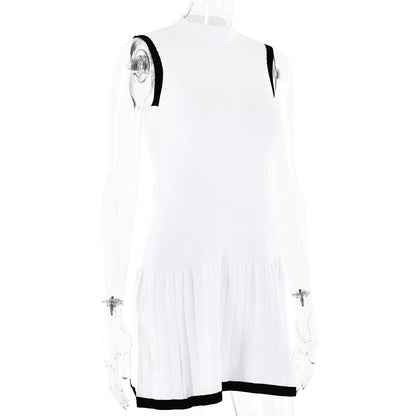Knitted Round Neck Pleated White Sleeveless High Waist Summer Tennis Casual Sporty Dress