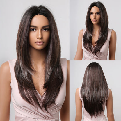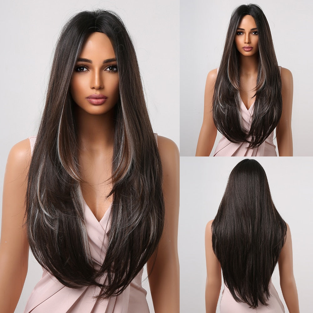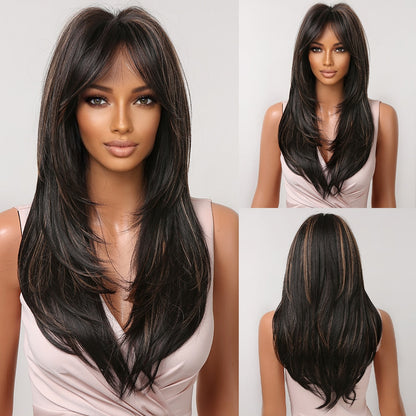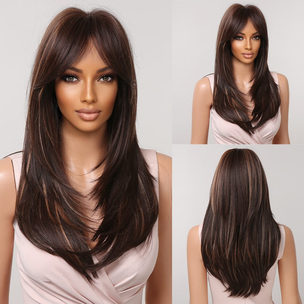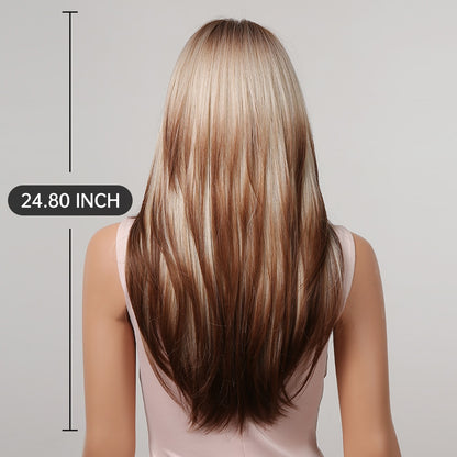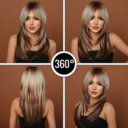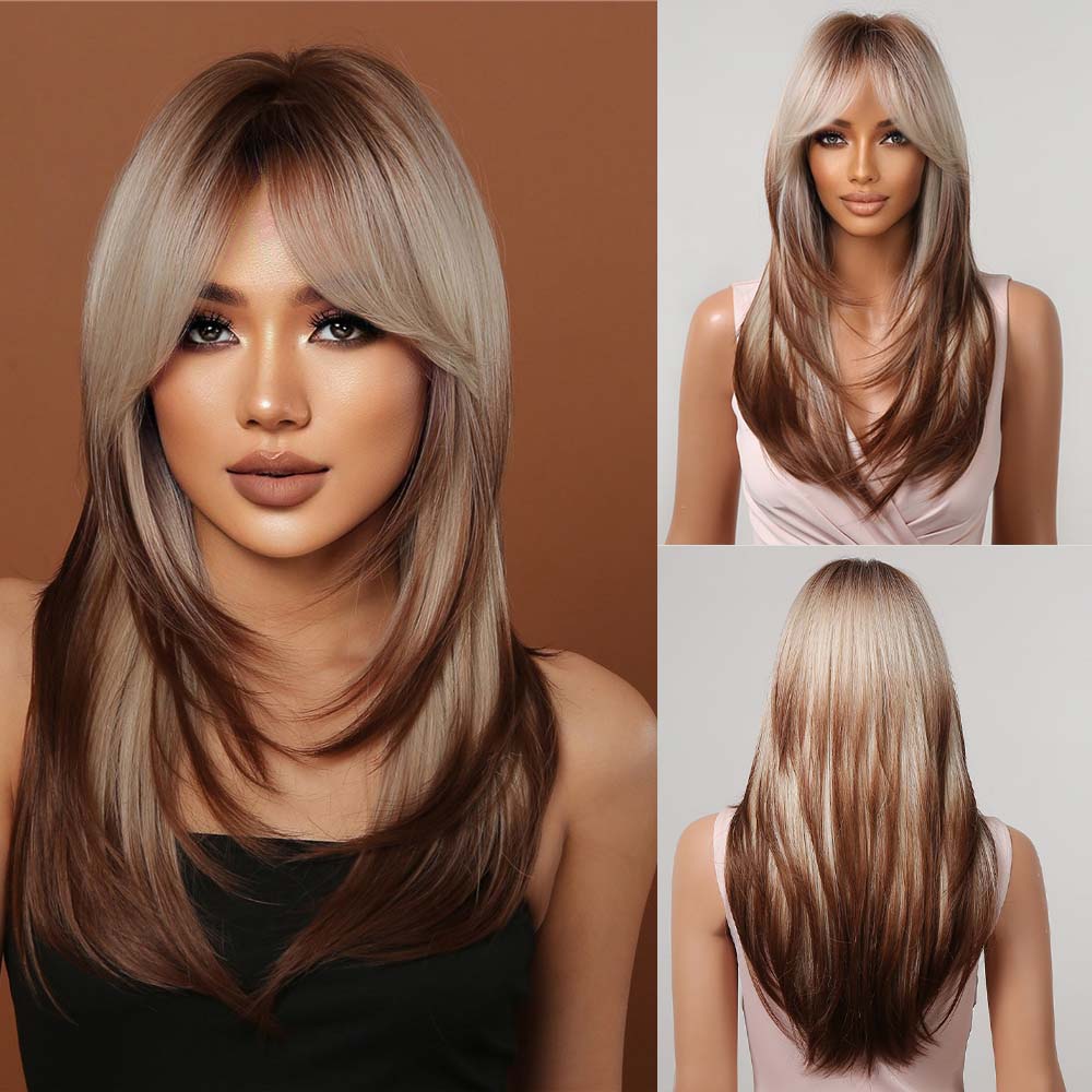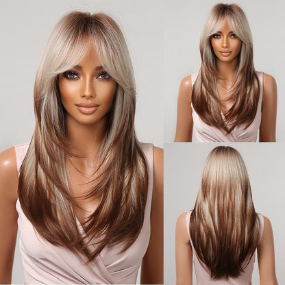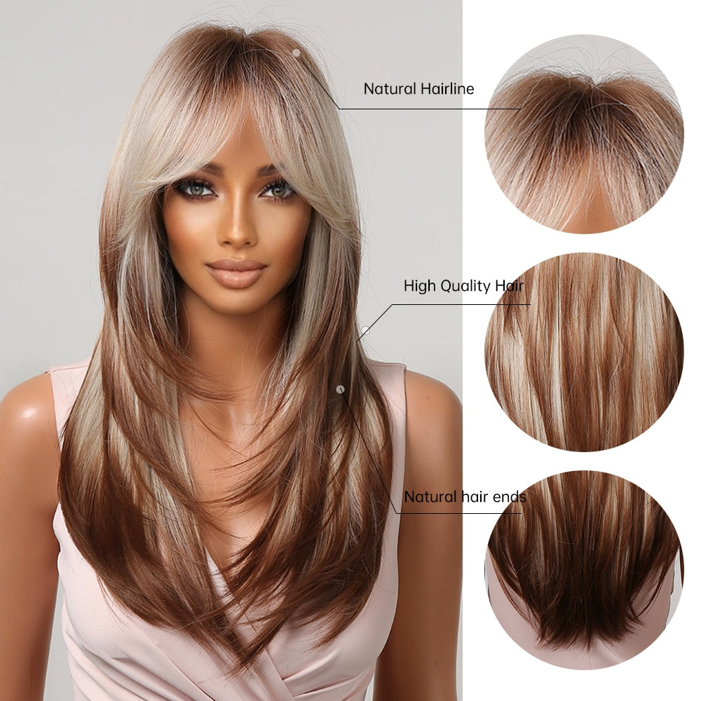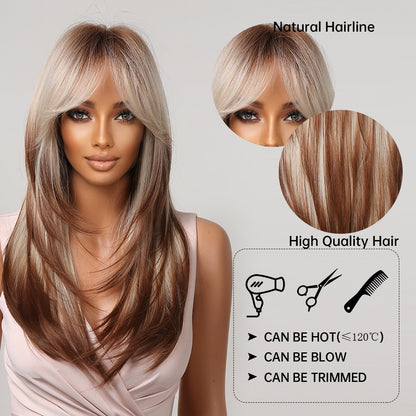 Long Straight Blonde Layered Synthetic Wigs Brown Balayage Ombre Wigs With Bang Cosplay Costume Heat Resistant Wigs