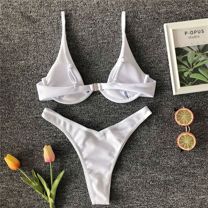 Neon V-bar Underwired Bikini Ribbed Swimsuit Women Thong Swimwear Two-pieces Bikini set Push up Bathing Suit