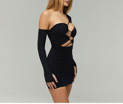 One Shoulder Bandage Bodycon Dress Long Sleeve Cut Out Mini Black Party Dresses Club Wear