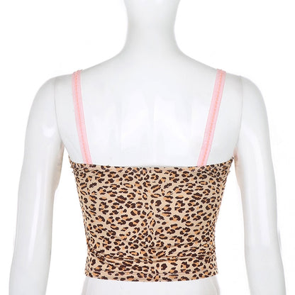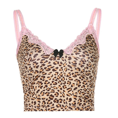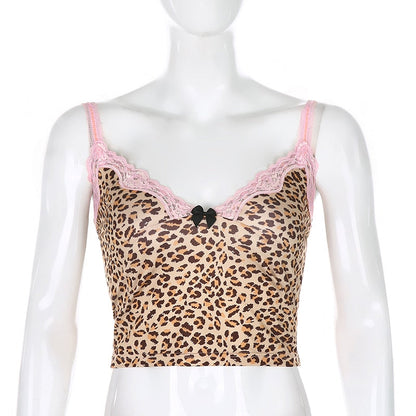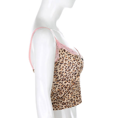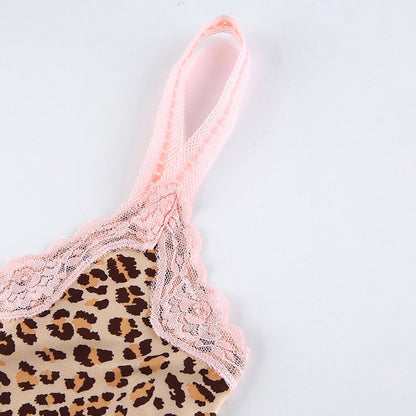 Pink Lace Sleeveless Cami Top Tee Summer Animal Print Backless Sexy Crop Top Leopard Spaghetti Strap Top