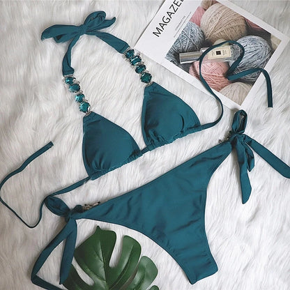 Rhinestone Two 2 Piece Swimsuit Crystal Thong String Bikini Set Women Swimwear Beach Wear Bathing Suit