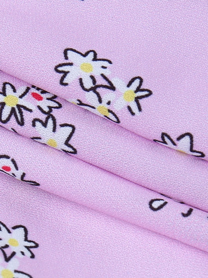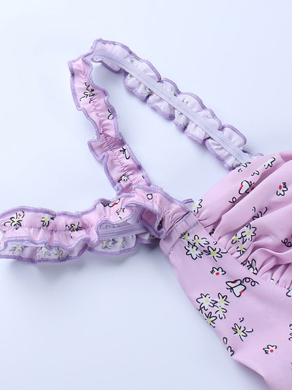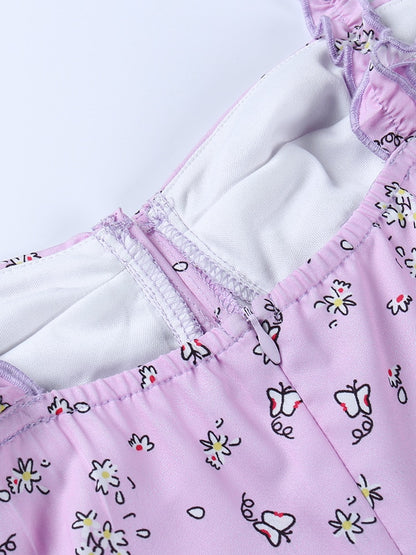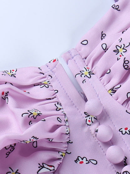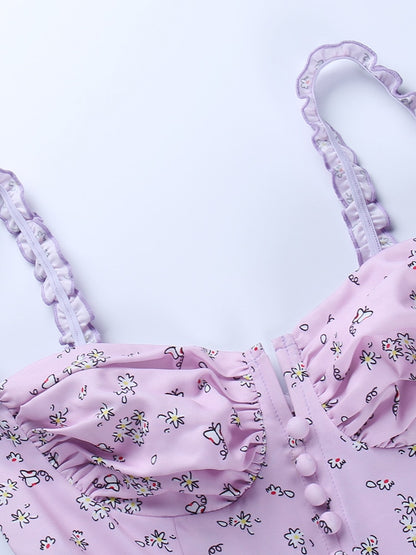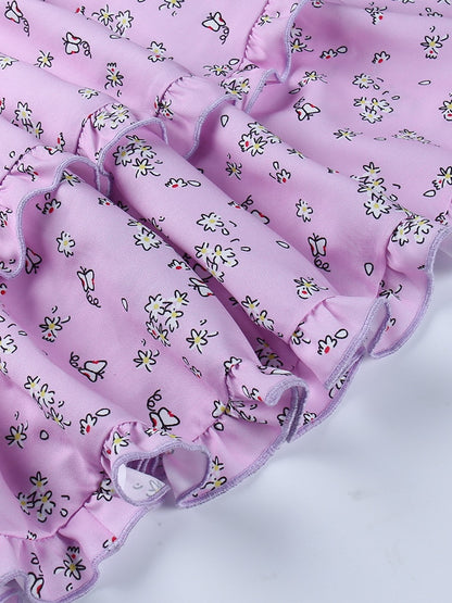 Ruffle Mini Dresses Floral Print Purple Button Sleeveless Y2K Women Casual Fashion Elegant Party Dresses