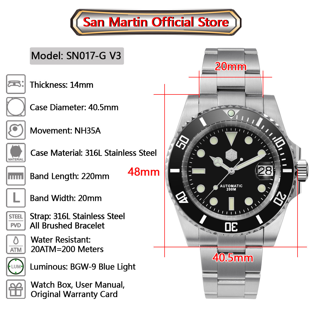 Pay in 4 instalments with AfterPay, Buy Now Pay LaterSan Martin 40.5mm Water Ghost V3 Sub Diver Luxury Men's NH35 Automatic Mechanical Business Wristwatches Sapphire 20Bar Watch