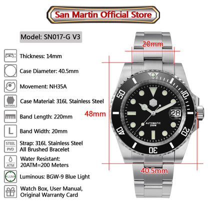 San Martin 40.5mm Water Ghost V3 Sub Diver Luxury Men's NH35 Automatic Mechanical Business Wristwatches Sapphire 20Bar Watch