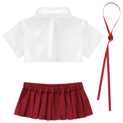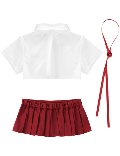 School Fancy Cosplay Costume Outfit Turn-down Collar Short Sleeves T-shirt Crop Tops with Ribbon and Mini Pleated