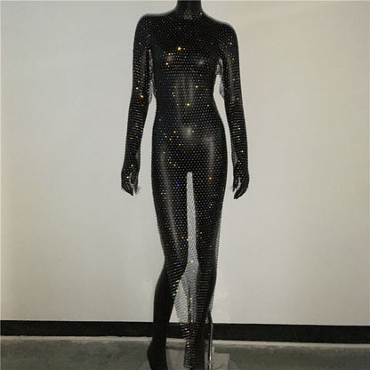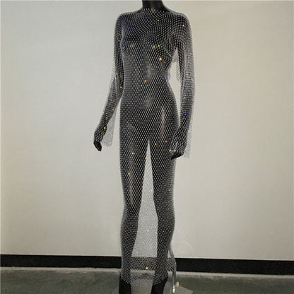 Shiny Rhinestones Grid Long Dress See Through Long Sleeves Fishnet Side Slit Long Dresses Chic Summer Beach Cover Up